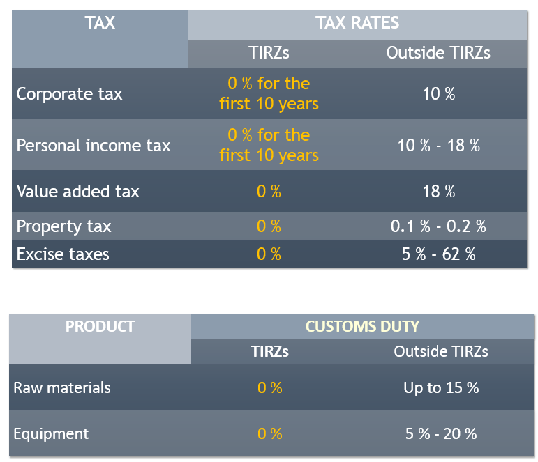 Investoren können staatliche Förderungen bekommen, deren Höhe von der Investitionsart, der Anzahl der geschaffenen Stellen und anderen Faktoren abhängen. Förderungen können Steuererleichterungen, Subventionen, bonifizierte Mieten Pachten oder andere Hilfen sein.