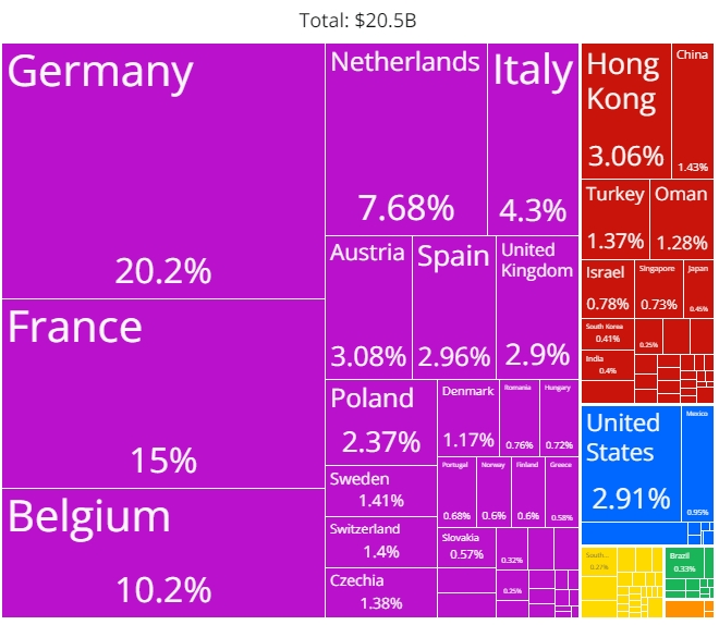 The most recent exports are led by Iron Blocks ($1.61B), Rubber Tires ($761M), Gas Turbines ($633M), Cars ($561M), and Cellulose Fibers Paper ($553M). The most common destination for the exports of Luxembourg are Germany ($4.15B), France ($3.07B), Belgium ($2.09B), Netherlands ($1.58B), and Italy ($883M).