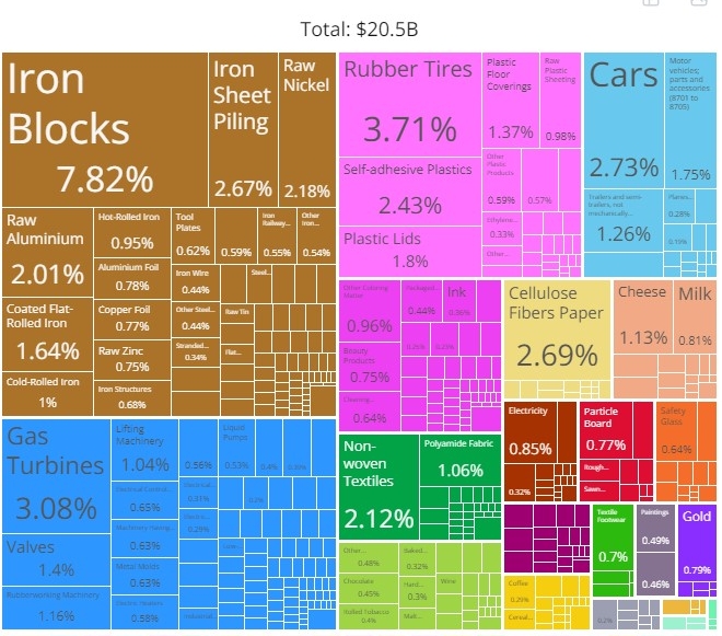 Remaining imports of 4.2 mio $ are mainly tobacco products and textiles.